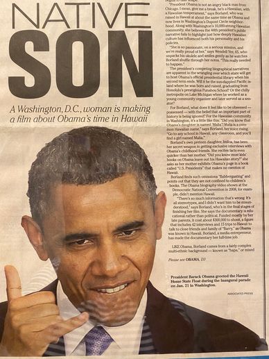 Feature story about Gloria Borland's efforts to make her documentary film BARACK OBAMA: MADE IN HAWAII.